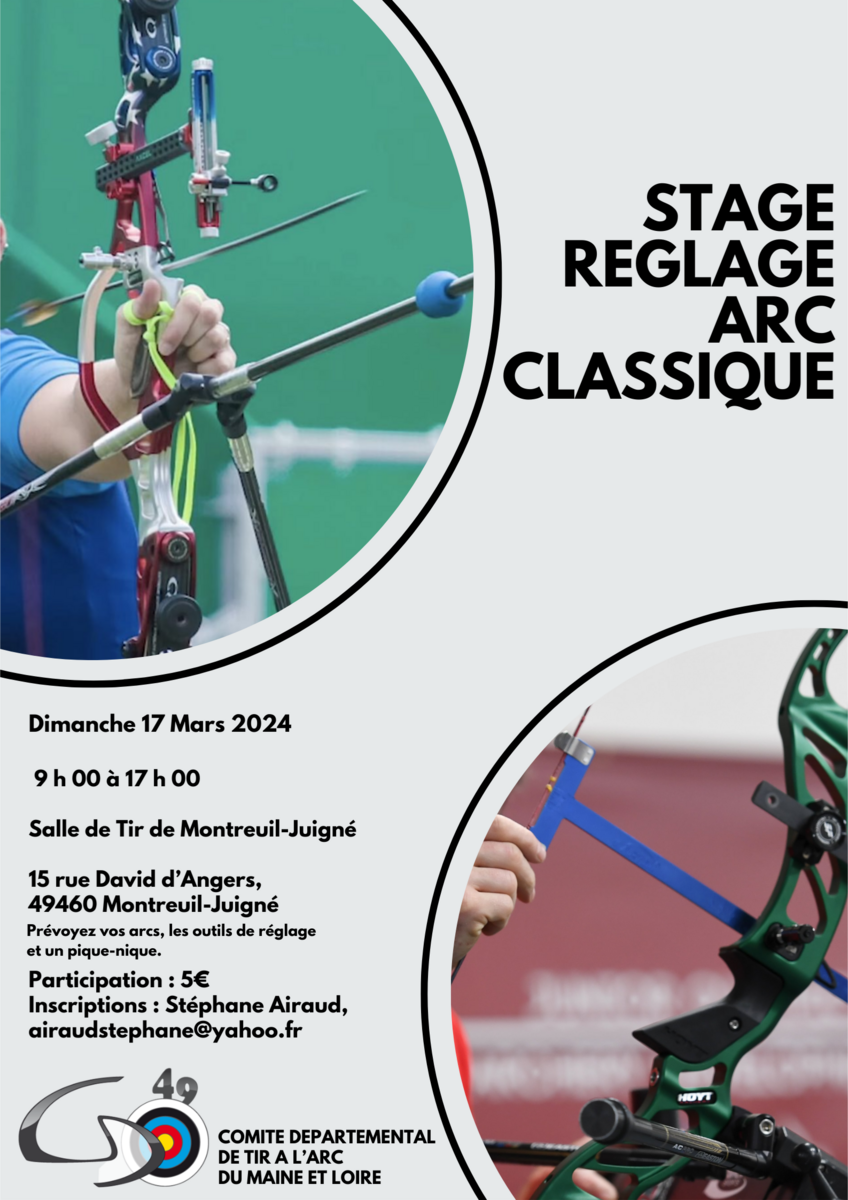 Un stage de réglage arc classique est organisé, par le CDTA49, le 17 mars 2024 de 9h00 à 17h00 à Montreuil Juigné.