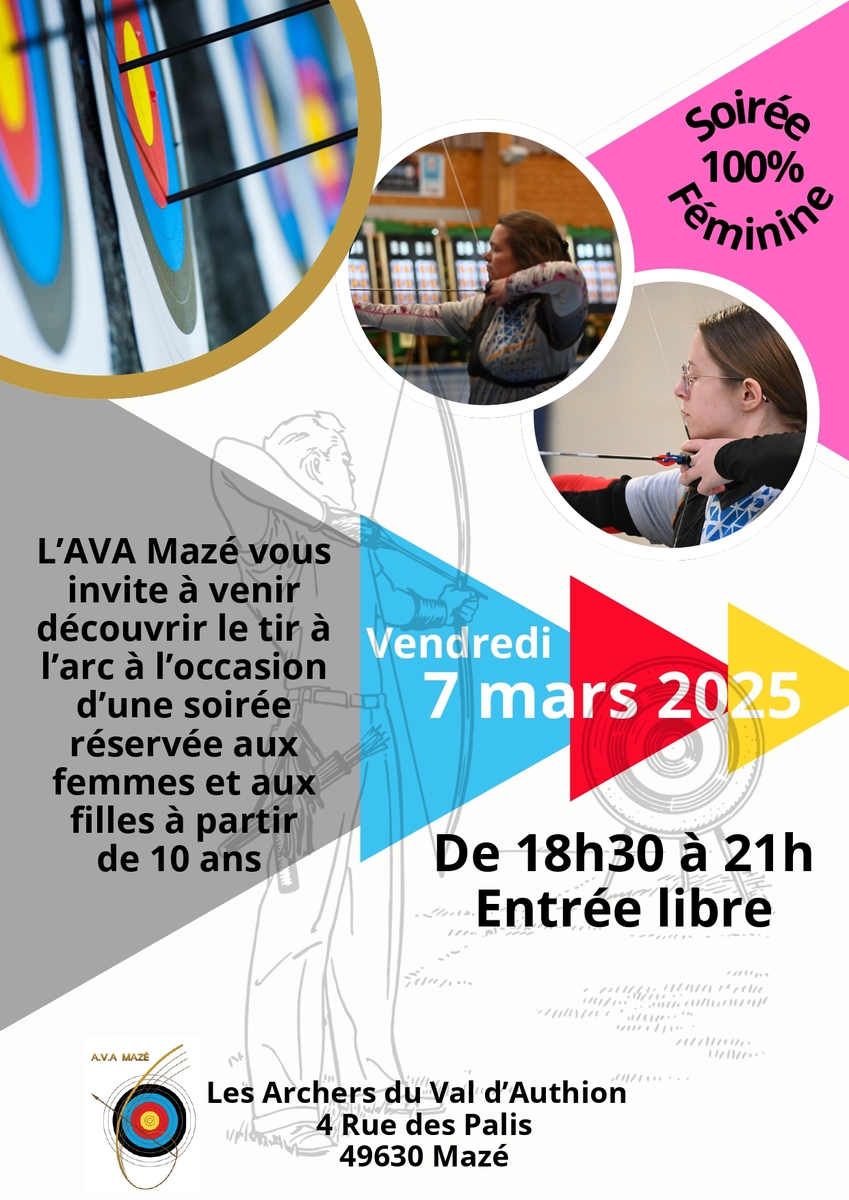 Bonjour à toutes et tous, Comme tous les ans, l'AVA MAZE organise une soirée découverte du tir à l'arc au féminin. Evènement lié à la journée internationale des droits de la femme. N'hésitez pas Mesdames à vous lancer. Le secrétaire de l'AVA